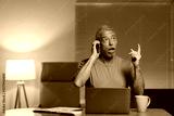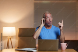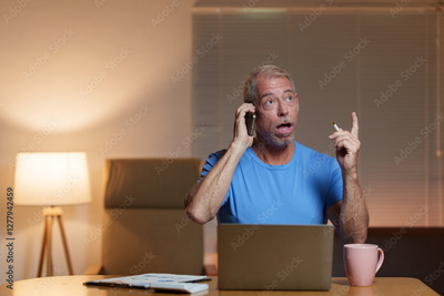 Surprised mature entrepreneur working from home at night having business call and holding pen while sitting at table with laptop and documents, having idea