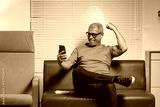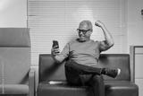 Excited senior man is looking at his smartphone and raising his fist in celebration, enjoying good news or achievement while sitting comfortably on a sofa in his modern home