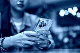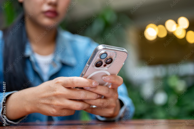 The close up shot of a woman, with face half hiding, holding a pink smartphone on the wooden tabletop.