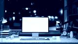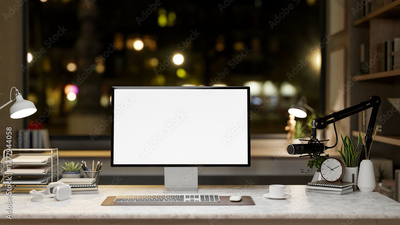 A White screen computer on the marble table with decorative items, Workspace with night time view.