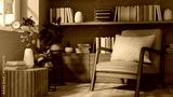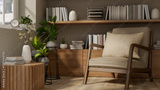 A wooden armchair and a table with decorative items in front of the build in wooden shelf.