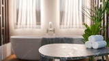 A grey marble tabletop with towels with blurry background of bathtub beside the flowing curtain.