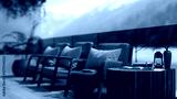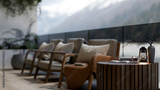 The wooden arm chairs with pillow and round table in front of a glass partitions with mountain view.