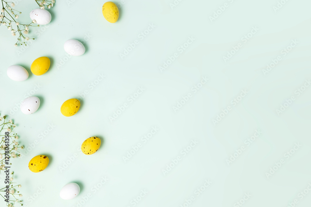 Easter holiday background, easter eggs top view empty copy space blank.