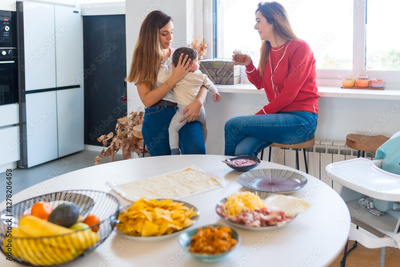 Mothers preparing mexican tacos and pizza with baby in kitchen