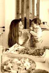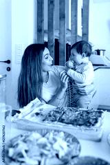 Mother holding her baby eating pizza at home
