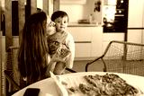 Mother kissing her baby while eating pizza at home