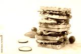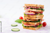 Club sandwich with chicken breast, bacon, tomato, cucumber and herbs