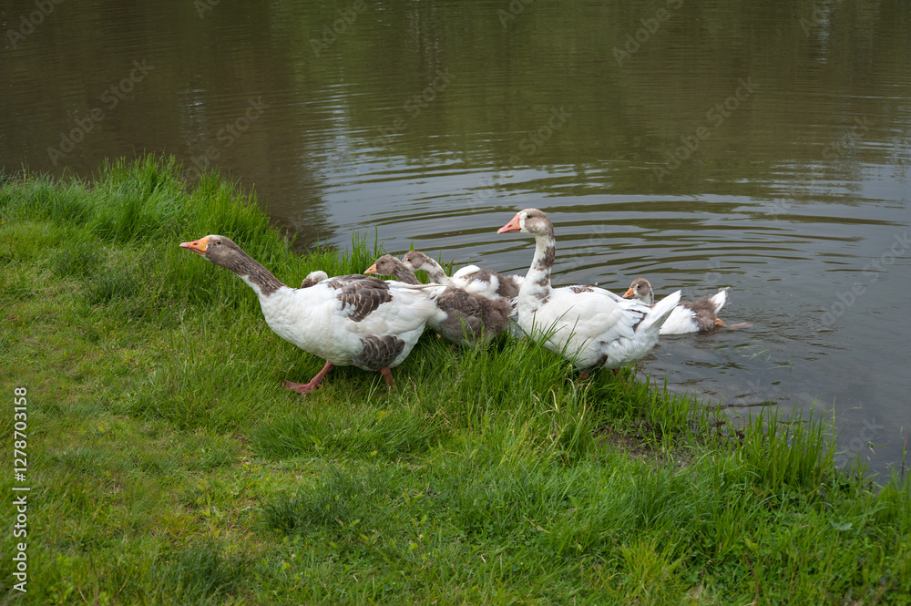 young domestic geese accompanied by their parents emerge from the water onto the grassy shore