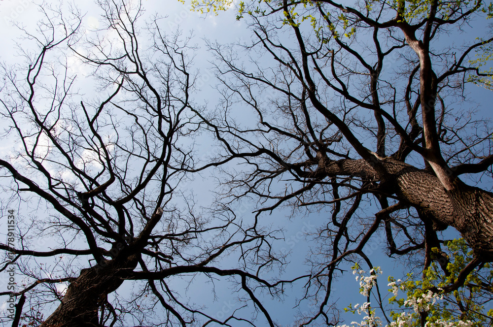Treetop twig in spring. Treetop of forest tree. Branch of tree top. Bare tree forest. Spring bare tree in winter forest. Natural scenery of forest twig. Environment concept