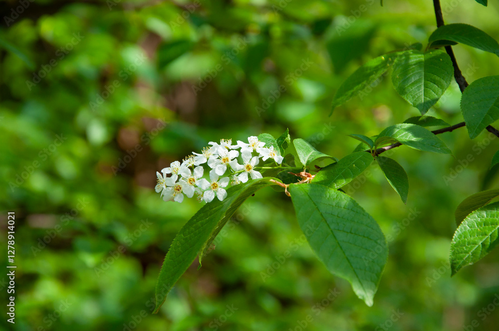 Beautiful spring hackberry flower on cherry tree. Hagberry flower in bloom in spring. Spring nature. Bird cherry with blooming flower. Blossom spring season. Mayday tree blossom with green leaves