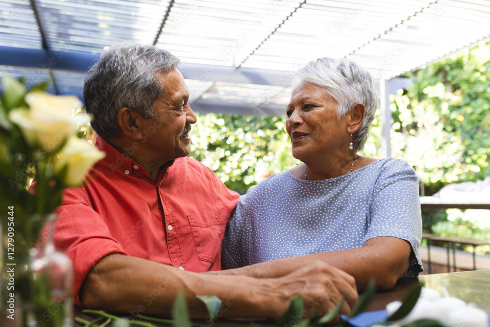 Smiling senior diverse couple sitting together at in garden cafe, enjoying conversation