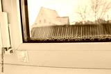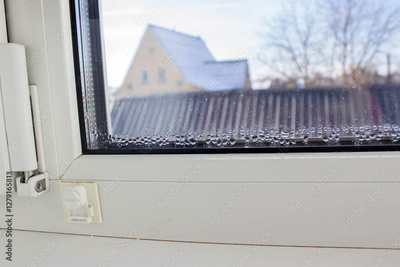 Close-up of condensation on a PVC window, white plastic window, humidity concept.