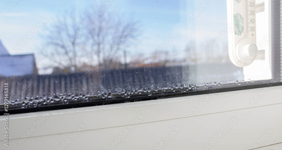 Close-up of condensation on a PVC window, white plastic window, humidity concept.
