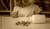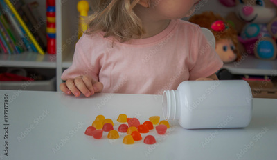 Little girl eating jelly candies or vitamins. Kid.