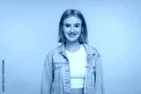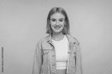 Close up of young hipster girl with colorful pastel pink short hair and nose piercing wearing casual blue denim jacket standing isolated over pink background looking at camera. People concept