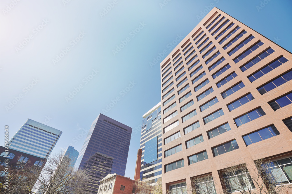 Vintage stylized photo of buildings in Denver downtown against sun, USA.