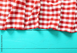 Frame of red plaid texture on blue wooden kitchen. Top view and copy space. Mock up