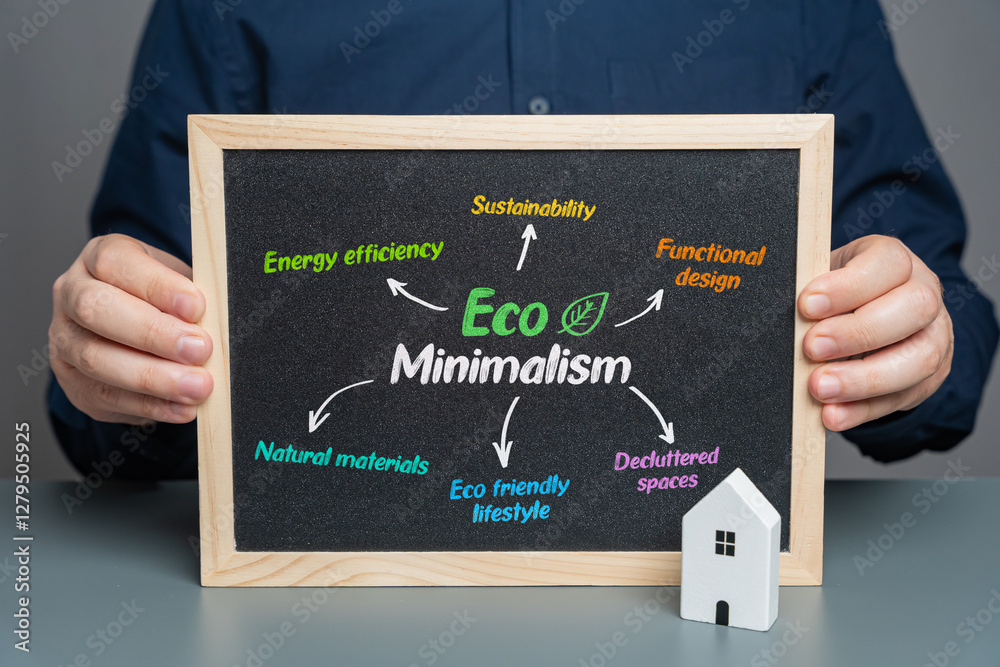 Eco Minimalism on a sign in the hands of a man. Sustainable living, simple design, environmental responsibility, and conscious consumption.