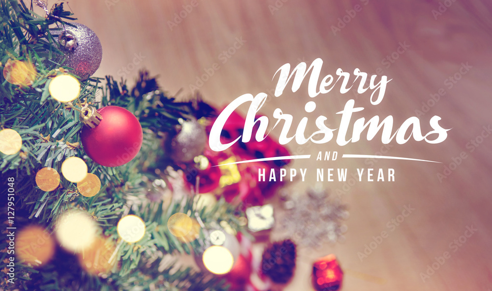 Merry Christmas and happy new year, Closeup of red bauble hanging from a decorated Christmas tree and light bokeh, Retro filter effect. Xmas background.