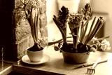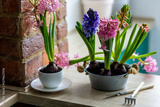 Kid's environmental project at home for ecology school lesson. Environment protection, eco friendly lifestyle. Growing bulbous hyacinth flowers in a pot on a windowsill. Spring gardening concept