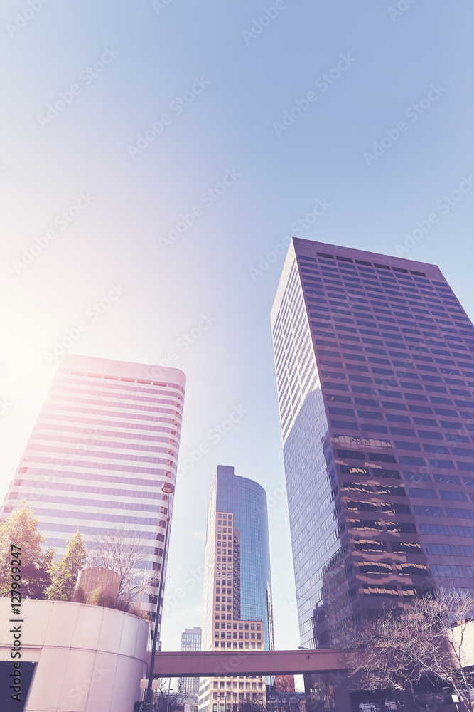 Vintage toned photo of Denver downtown skyscrapers against sun, Colorado, USA.