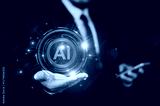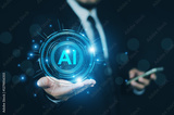 Futuristic technology concept with a businessman activating an AI-powered system through a virtual touch interface highlighting innovation and automation