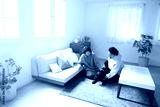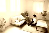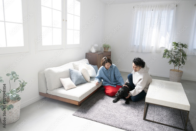 大型犬を飼う家族、リビングフリー大型犬 広角のやや俯瞰