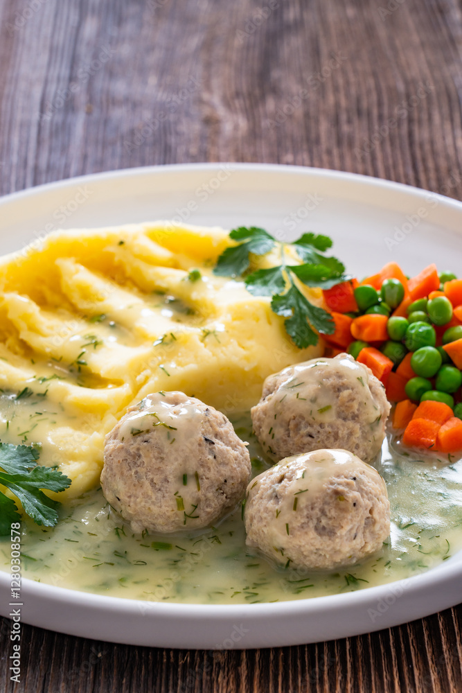 Boiled meatballs in dill sauce with mashed potatoes and boiled carrot and green peas on wooden table
