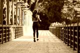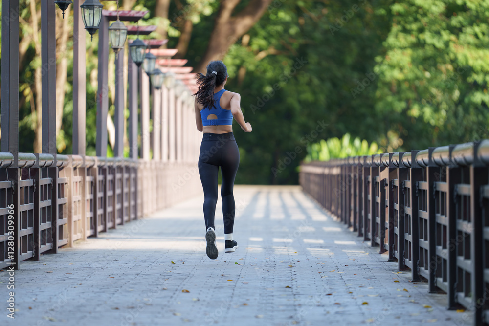 Sporty woman running on a bridge in a park, enjoying a sunny day while engaging in her outdoor workout. Surrounded by trees and greenery, she embodies a healthy, active lifestyle