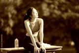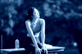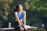 Young sportswoman is sitting on a bench in a park, resting after her training session and enjoying the fresh air, with a water bottle and towel next to her