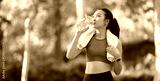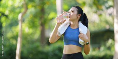 Asian sportswoman drinking water from a bottle after training in a green park, enjoying a healthy lifestyle and taking care of her hydration