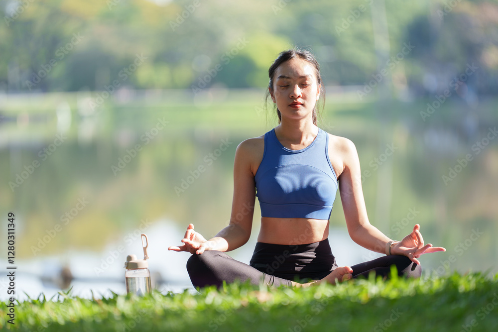 Young asian woman wearing sportswear is practicing yoga and meditation in the lotus position near a lake in a park, promoting mental and physical wellness