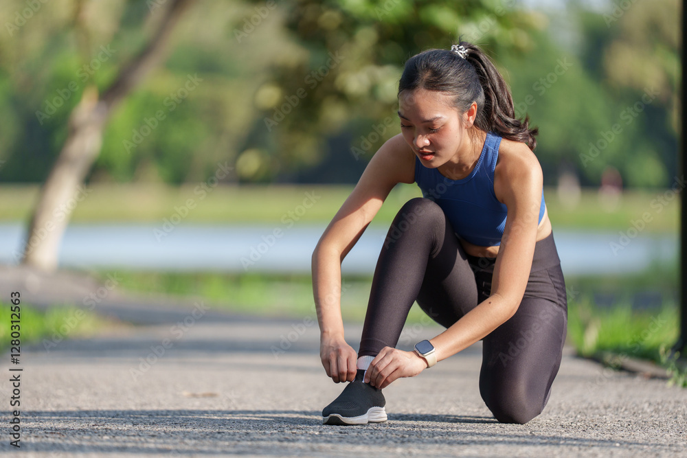 Young asian sportswoman tying shoelaces on running shoes, preparing for jogging in a green park on a sunny day, promoting a healthy lifestyle and fitness
