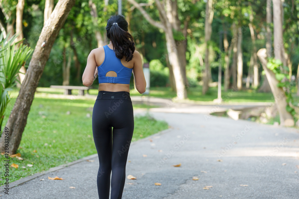 Young sporty woman jogging along a path in a lush green park, relishing her workout and embracing a healthy lifestyle amidst the serene beauty of nature on a sunny morning