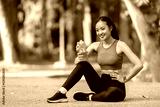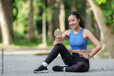Happy athletic woman sitting on the ground holding a bottle of water after exercising outdoors, enjoying a healthy lifestyle and taking care of her well-being
