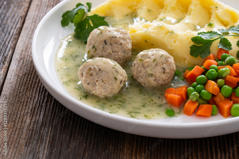 Boiled meatballs in dill sauce with mashed potatoes and boiled carrot and green peas on wooden table