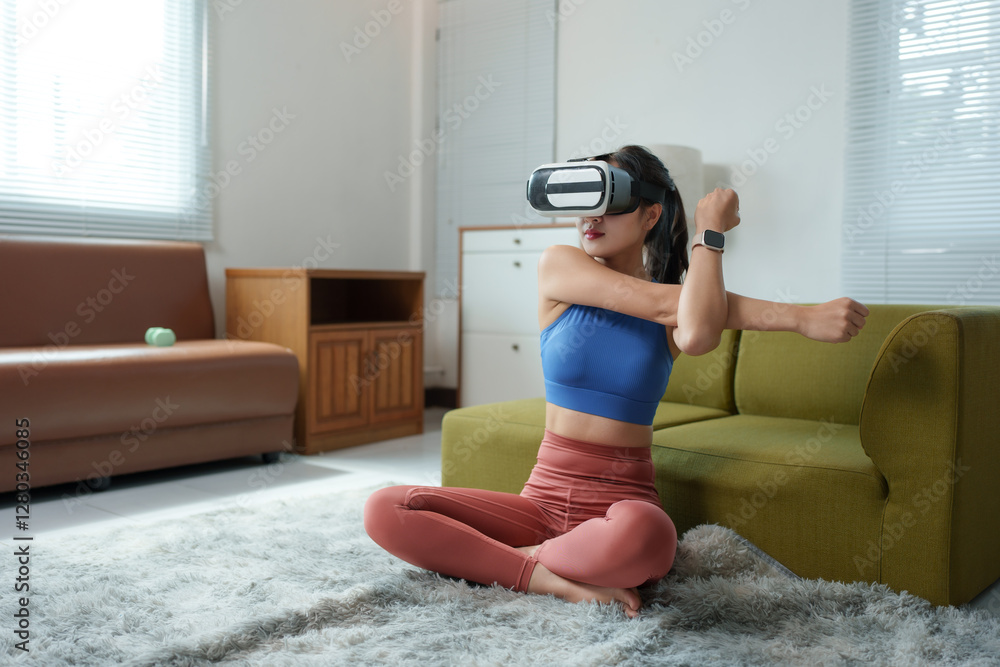 Young woman wearing sportswear and vr goggles stretching arms while sitting on floor in living room and enjoying virtual reality fitness experience