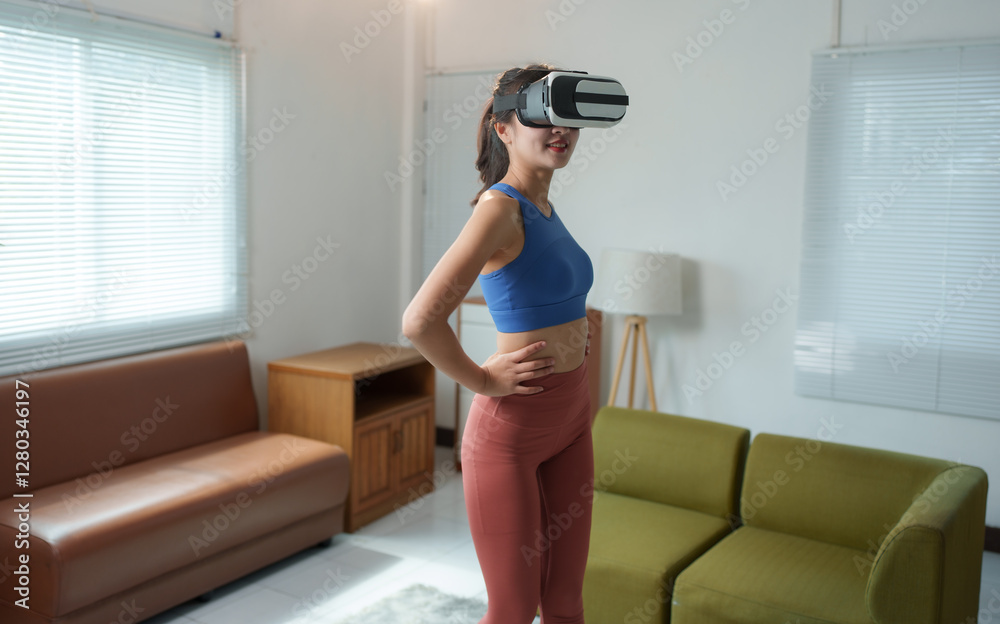 Young sporty asian woman wearing virtual reality headset is exercising at home in her living room using vr goggles for her fitness training