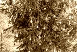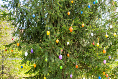traditional colored Easter eggs hanging on green spring branches spruce tree in rays bright sun, decorating Easter tree, Beautiful natural background, preserving folk tradition