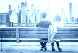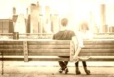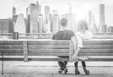 couple relaxing on New york bench in front of the skyline at sun
