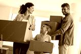Happy family with cardboard boxes in new house at moving day. Mortgage, family, real estate concept