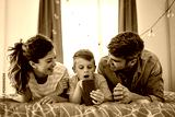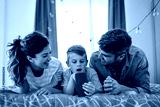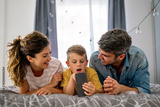 Happy parents with kid using smartphone at home together, playing, having fun with dog