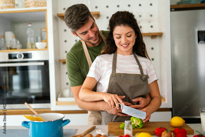 Young happy couple is preparing healthy meal in their kitchen together at home. Healthy lifestyle