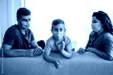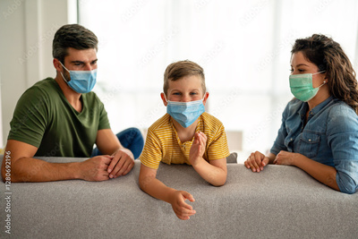 Sad family wearing protective medical mask for prevent virus, flu, pollution. Family protection
