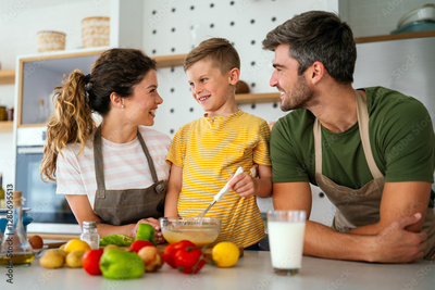 Mother and father making breakfast with son. Young family preparing delicious food in kitchen