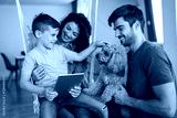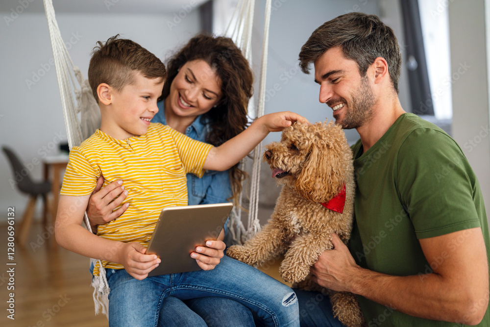 Happy family with kid having fun using tablet together, parents and child laughing relaxing at home