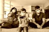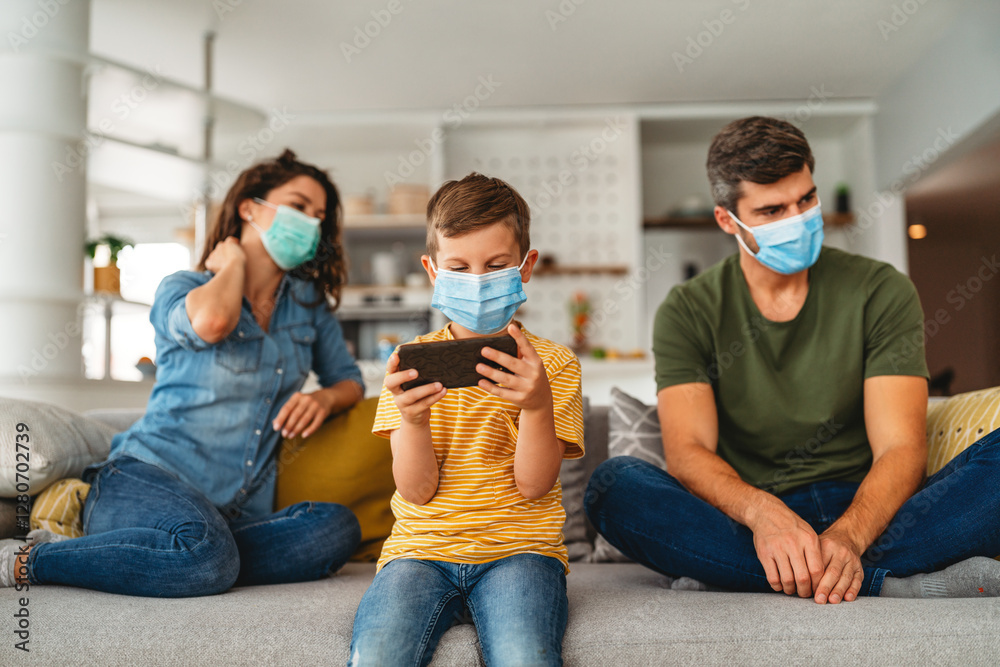 Sad family wearing protective medical mask for prevent virus, flu, pollution. Family protection