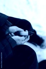 an eleven year old child tries a nicotine-free disposable cigarette on a city street