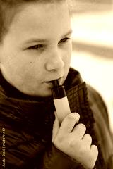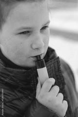 an eleven year old child tries a nicotine-free disposable cigarette on a city street